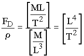 Since there are 5 dimensional variables and 3 dimensions, there are two dimensionless variables for this problem. The units can be canceled in steps, beginning with the parameter which has the largest number of dimensions. In this case, the process will begin with the drag force, which has the largest number of dimensions when expressed in terms of mass. First divide the force by the density to cancel the mass dimension:
