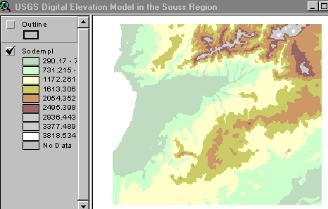 Close this view and open the View delin. You will see the clipped portion of the DEM that we are actually going to use for watershed and stream network delineation of the Souss basin. This DEM originally had a cell size of 30" and was developed by Sue Jenson and her co-workers of the US Geological Survey in Sioux Falls, South Dakota from the Digital Chart of the World. This grid is available for all of Africa on internet, and similar DEMs are also available on internet from the USGS for the other major continents. The DEM shown here was clipped from the Africa continental DEM and projected into a Lambert Conformal Conic projection which is is a standard for this region of Morocco.