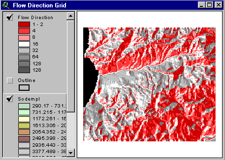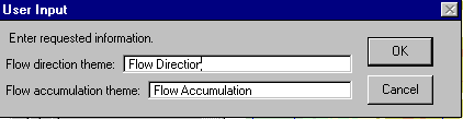 Now, we will switch to the part of the exercise that can be executed with either Arcview 2.1 or Arcview 3.0. The inputs to this exercise include the watershed and stream network computed as shown in the previous part of the exercise but with a larger threshold drainage area, so as to simplify the resulting network.