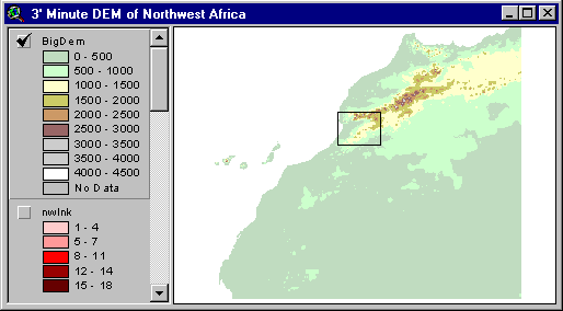 To take a look at the area you will be working with, open the View BigDem. You will see a digital elevation model of northwest Africa with a box outlining the area of the DEM that was used to analyze the Souss Basin. This DEM was prepared by Michael Hutchinson and his co-workers at Australian National University and has a cell size of 3'. The high Atlas Mountains lie to the North of the Basin while the central plain contains the Souss River, which flows into the Souss River at the Atlantic Ocean at Agadir. The elevations in this region range from 0 to 4500 m, here shaded in 500m increments. The region of the Souss Basin is shown in the small box, where the Atlas mountain range reaches the Atlantic coast.
