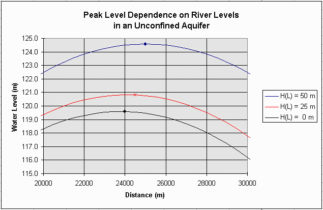 Things To Do: Prepare a graph of the piezometric head profile in the aquifer like the one shown above for the three cases for H(L). What proportion of the flow goes to the left as compared to the right hand river for each of the cases?