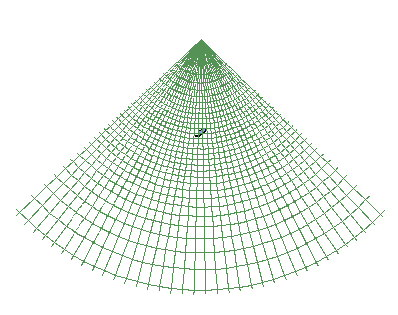 Para ver Marruecos en proyección Lambert Cónica Comforme, resalte el Theme afrbord.shp, vaya a View/Properties, cambie las Map Units a decimal degrees, haga un click en la barra de Projection, haga un click en Custom y en la ventana Projection Properties seleccione la proyección: Lambert Conformal Conic. Defina el Meridiano Central como -7°, el primer paralelo estándar como 29°, el segundo paralelo estándar como 34.5°, y la latitud de referencia como 25. Haga un click en OK en las dos ventanas para transformar la View al dominio proyectado. Note como los meridianos se abren (como un abanico) desde un origen ubicado en el centro de la rotación de la tierra (esto se debe al uso de una proyección cónica centrada en el eje de rotación de la tierra). La figura mostrada es la misma que obtendría cortando un cono y desarrollándolo hasta que quede plano.