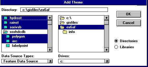 Le projet intitulé hydro.apr contient divers scripts qui sont utilisés pour simuler l'écoulement de surface. Pour établir le model de simulation d'écoulement de surface pour le bassin du Souss, ouvrez le projet hydro.apr. Ouvrez une nouvelle vue et ajoutez la couverture linéaire sorivsb, les couvertures polygonale et linéaire pour soshdcdb, et les couvertures ponctuelles rainst et hydrost. Le menu "Add Theme" que vous devriez voir ressemble à ceci: