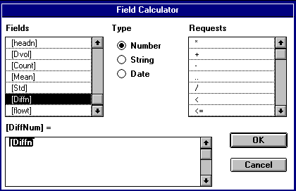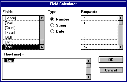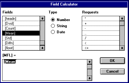 Vous devez également spécifier le champ représentant la longueur moyenne de l'écoulement -- "MFL" -- dans ce tableau parce que les nombres dans ce champ sont utilisés pour estimer les pertes lors de l'écoulement sur la terre. Sélectionnez le thème "MFL" et utilisez la calculatrice comme cela est montré ci-dessous.