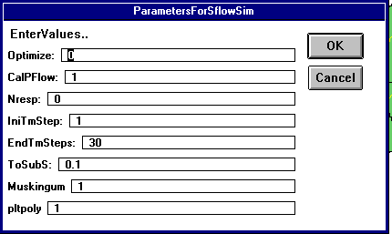 Le paramètre Optimize égal a 0 indique qu'il s'agit simplement d'un run de simulation. CalPflow=1 indique que l'écoulement du polygone va être calculé dans ce run. Nresp=0 indique qu'aucune "response function" ne sera utilisée dans ce run. IniTimeStp et EndTimSteps indiquent le nombre de jours simulés. ToSubs=0.1 indique que 10% du surplus du polygone va dans un reservoir souterrain, Muskingum = 1 indique que la méthode de Muskingum Cunge d'évaluation de l'ecoulement du fleuve est utilisée, et plotply=1 indique que les contours des polygones seront mis en relief durant les calculs. A la fin du programme, il vous sera demandé si oui ou non vous désirez selectionnez la trajectoire de l'ecoulement ("flow path"). Cliquez YES.