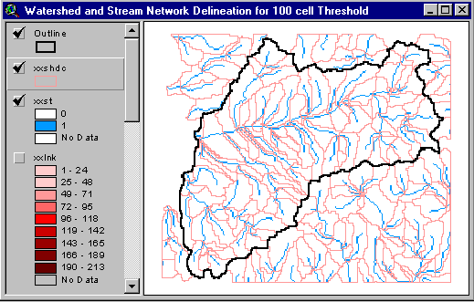 Nous allons maintenant aborder la partie de l'exercice qui peut être exécutée avec Arcview 2.1 ou avec Arcview 3.0. Les données pour cet exercice incluent le bassin et le réseau de cours d'eau défini d'une façon identique à celle présentée dans la partie précédente de l'exercice mais pour un seuil de zone de drainage supérieur, de façon à simplifier le réseau qui en résulte.