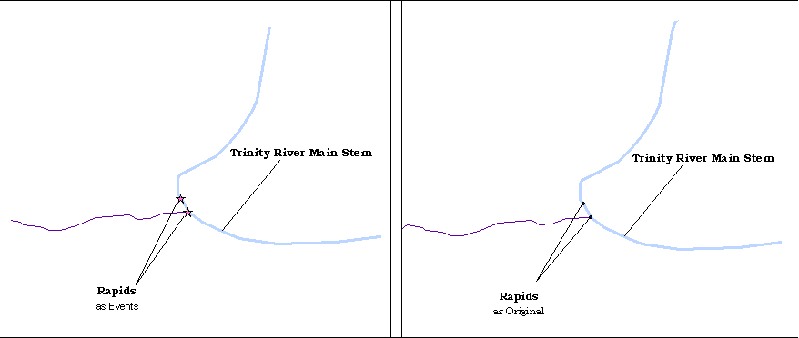 Route Events are occasions located along a route. To create a route event one must first decide on what one would like to symbolize with the route event. It was decided for this study to reference two rapids that are located on the Trinity River in the focus area. The image below shows the location of the points.