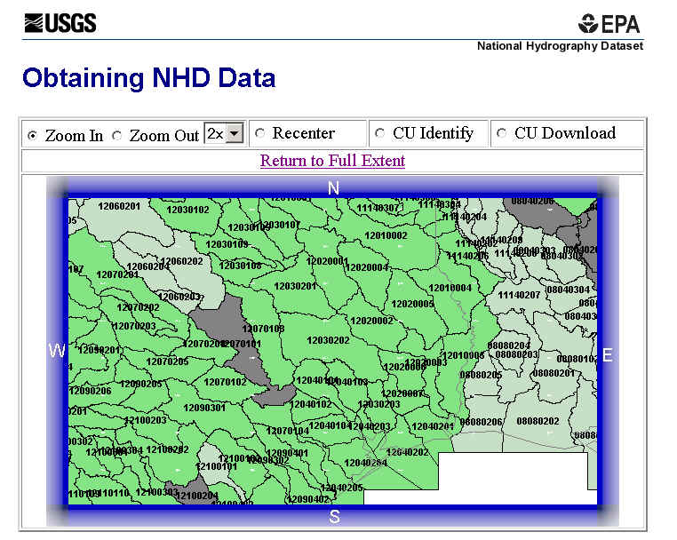When data from the NHD is downloaded, it is in a compressed format. The information is provided in a workspace that contains all three coverages described above as well as some INFO data tables and some informational text files. Each workspace covers one 8-digit HUC unit. This is a convenient method to present data and convey it since the information in the workspace is interrelated and dependent on one another. The image below shows a screen shot of the NHD data acquisition web page zoomed into the CUs used in this study.