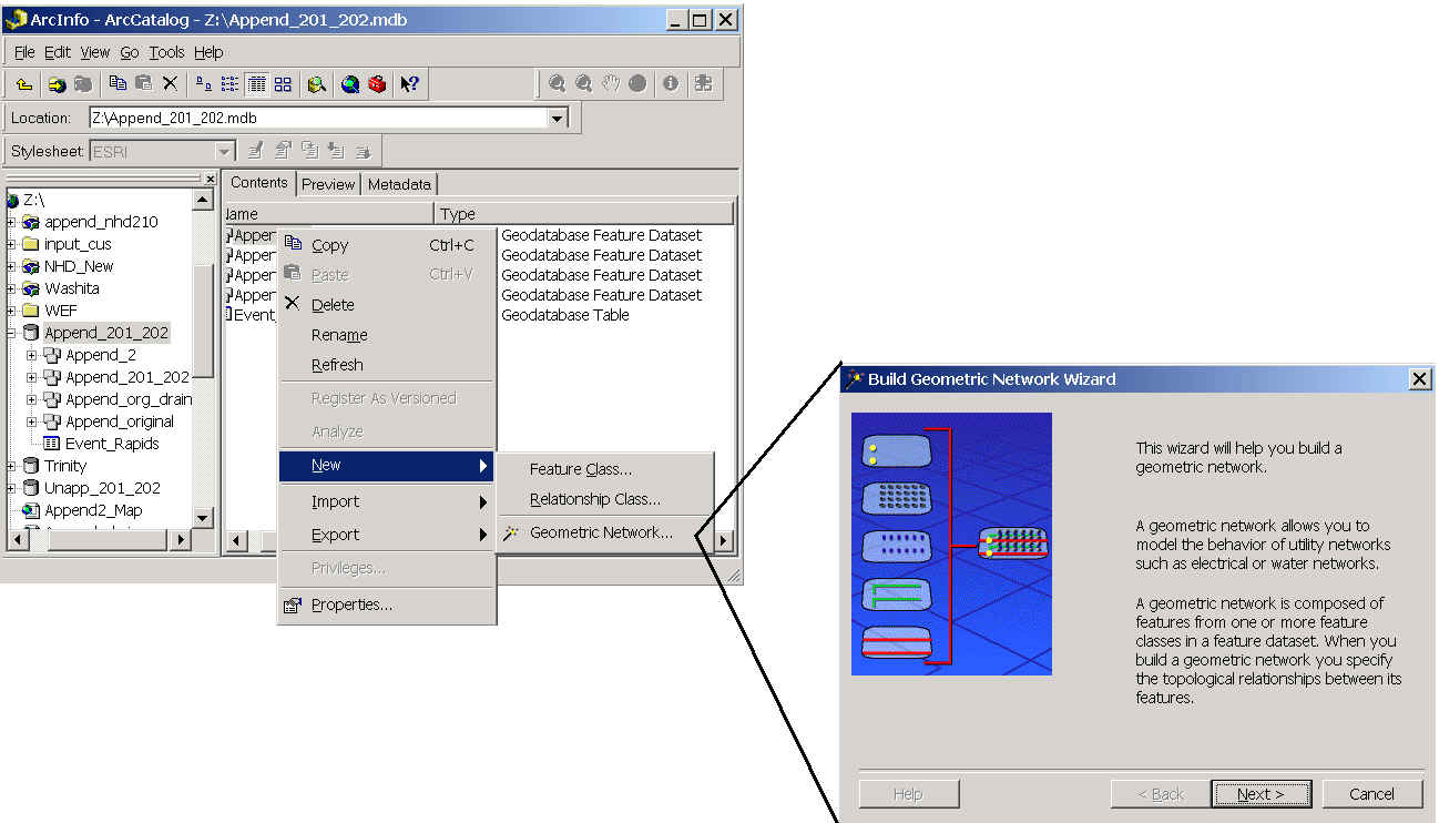 The question is, however, if there a difference between CUs that have been appended and ones that have not been appended. To see if there is a difference, a network was created using an appended workspace and the non- appended workspaces. The network was created in ArcInfo using the network features in ArcCatalog and ArcMap. Two Personal Geodatabase Feature Datasets were created with one containing the workspace created by Append and the other containing information from the original workspaces. Then the Geometric Network Wizard was used to create a network for each feature dataset using the route.drain polyline since it was found the simple edges in this theme allowed for a uncomplicated creation of a network.