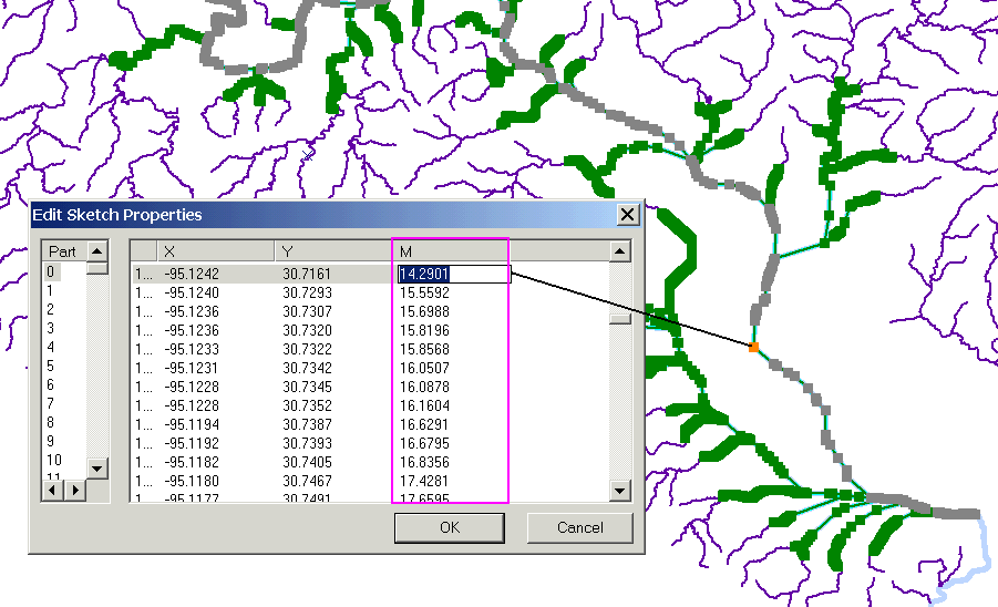 Often times when one has created a network the question arises, " Where am I on the river?" One may want to determine how far an event, such as a discharge from a waste water treatment plant, is from the outlet of the watershed. Another bit of information possibly needed would be how far the riverside development is located from a flood control dam. It is just like when you are looking at a road network and you are looking for the address of a specific building. So, to answer this question, "Where am I on the river?", an additional measure is added to the Cartesian (x, y) coordinates of the river. This measure is called the m-measure. Linear Referencing does require ArcInfo 8.1 and m-measures only appear on the polyline M geometry. To show the m-value for a polyline M the Edit toolbar must be used and the task option must be set to Modify Feature.