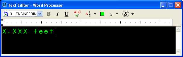 I.10. In the Text Editor - Word Processor dialog box, set Font to 3 (Font=ENGINEERING) and enter "X.XXX feet" where X.XXX is the value determined by the measure distance command from Step I.5.