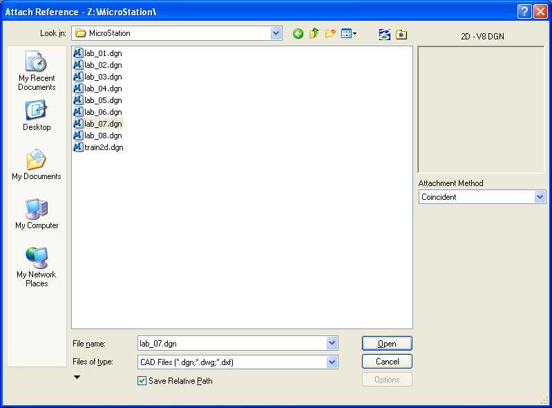 H.3. In the Attach Reference dialog box under Files of Type, choose CAD Files (*.dgn;*.dwg;*.dxf); under Look in, select Z:\MicroStation; in File name, choose lab_07.dgn; set Save Relative Path to on; under Attachment Method, select Coincident; and Press the Open push button. An Alert box may appear stating "Path not part of MS_RFDIR; press the OK push button.