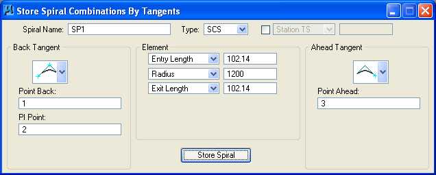 E.5. In the Store Spiral Combinations By Tangents dialog box, in the Element group, set Entry Length to 102.14 feet, set Radius to 1200 feet, and set Exit Length to 102.14 feet.