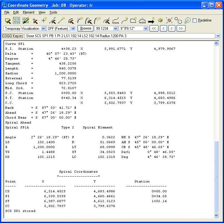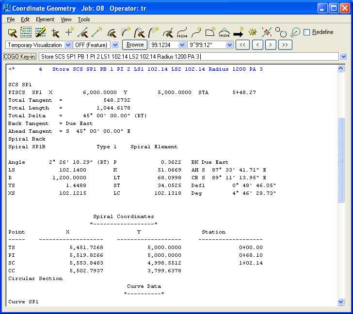 E.7. Press the Store Spiral button and close the Store Spiral Combinations By Tangents dialog box. The command issued to perform the operation (Store SCS SP1 PB 1 PI 2 LS1 102.14 LS2 102.14 Radius 1200 PA 3) is displayed in the upper part of the Coordinate Geometry dialog box while information about the spiral is listed in the lower part of the Coordinate Geometry dialog box. Notice that the 1st element is called a Spiral Back and named Spiral SP1B, the 2nd element is called a Circular Section and named Curve SP1, and the 3rd element is called a Spiral Ahead and named Spiral SP1A.