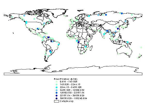 Runoff: the attribute file contains an identity number dischar_id which can be linked to the mean monthly and mean annual runoff values contained in a separate table called data.dbf which contains the same identity number for each station. The mean monthly and mean annual runoff values in m3/s along with the first and last years of record and the number of years of record.