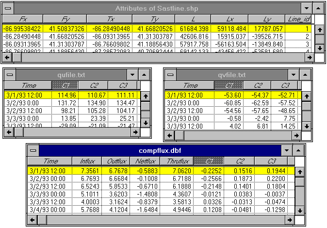 The flux values can be divided by the drainage area (698,525 km2) and by the water density (1000 kg/m3), and converted from units of 10^12 kg/12 hr into mm/12 hr. This computation can be done in Excel which imports the compflux.dbf file directly from Arcview. The resulting net flux and through flux are shown below:
