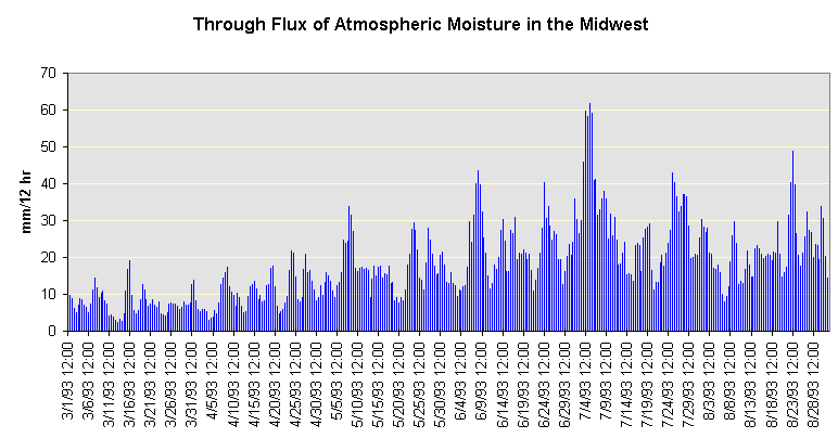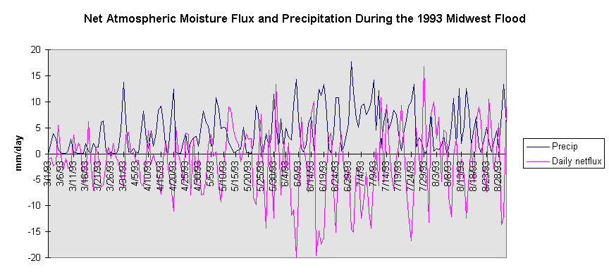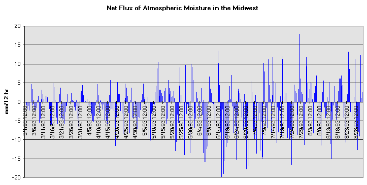 You can see the periods of intense atmospheric flow in the through flux line. In the net flux line, the negative values indicate that inflow was greater than outflow, or that precipitation was greater than evaporation. The positive values indicate the reverse. As expected there are a majority of negative values, which contribute the moisture extracted from the air stream to supply precipitation during the flood.