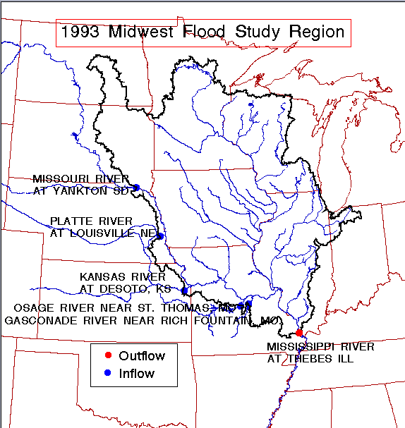 The SAST study team defined the region of study below, which comprises all the drainage area of the Upper Mississippi River Basin and part of the Missouri River basin below Yankton, South Dakota. The drainage from western tributaries of the Missouri River, such as the Platte River and the Kansas River was cut off at gaging stations where the contributing flow from those drainage regions was known. The outlet of the study region is the Mississippi River at Thebes, Illinois, just upstream of the junction of the Mississippi and Ohio Rivers.