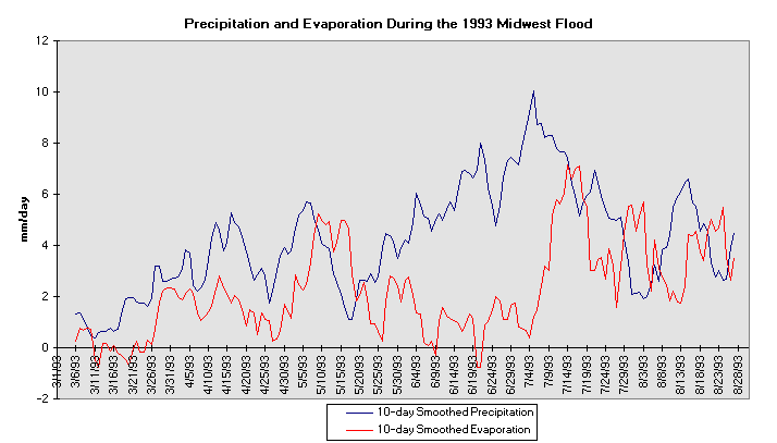 If 10-day averages of precipitation and evaporation are taken, it appears