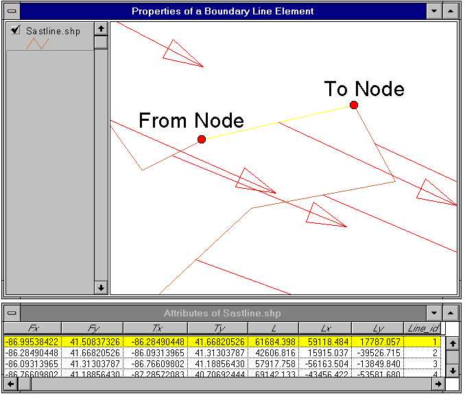 The boundary of this region was generalized by selecting a point each 100 km along the boundary and then joining these points by straight lines. Horizontal and vertical components of these lines in the S-N and W-E directions were formed by forming component lines in geographic coordinates (latitude-longitude) and projecting these into a Lambert Azimuthal Equal Area projection for the region. This map projection was chosen to preserve areas and the mutual relationship among the directions of the lines. The boundary line elements each have a From Node and a To Node at the ends where the direction of the nodes is arranged as being clockwise around the border of the study area. Here is a zoomed in view of the first boundary element. The length of the line is 61,684m, and its lx = 59,118m while its ly = 17,787 m. Note that squaring and summing the component lengths does not yield the square of the resultant length because in the projected planar domain, the components may no longer be mutually perpendicular as they are in geographic coordinates. The From Node of the line is located at (86.9954W, 41.5084N) and its To Node is located at (86.2849W, 41.6682N) where the longitudes (W) and latitudes (N) are given in decimal degrees.