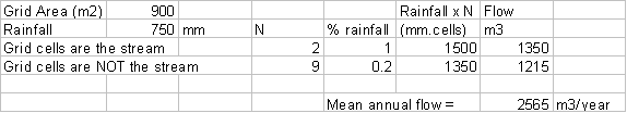 e) Assume that these are 30m grid cells and that the mean annual rainfall over this area is 750mm. Consider that on grid cells that are streams (as determined by the theshold of 5 cells above) all the rainfall becomes runoff, but that on grid cells that are not streams 80% of rainfall is lost through evapotranspiration and infiltration and only 20% of rainfall becomes runoff. Determine mean annual flow into grid cell A in m3/year.
