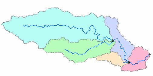 Following are subsets of the “Catchment”, “DrainageLine” and “Drainage Point” feature classes derived using Arc Hydro.